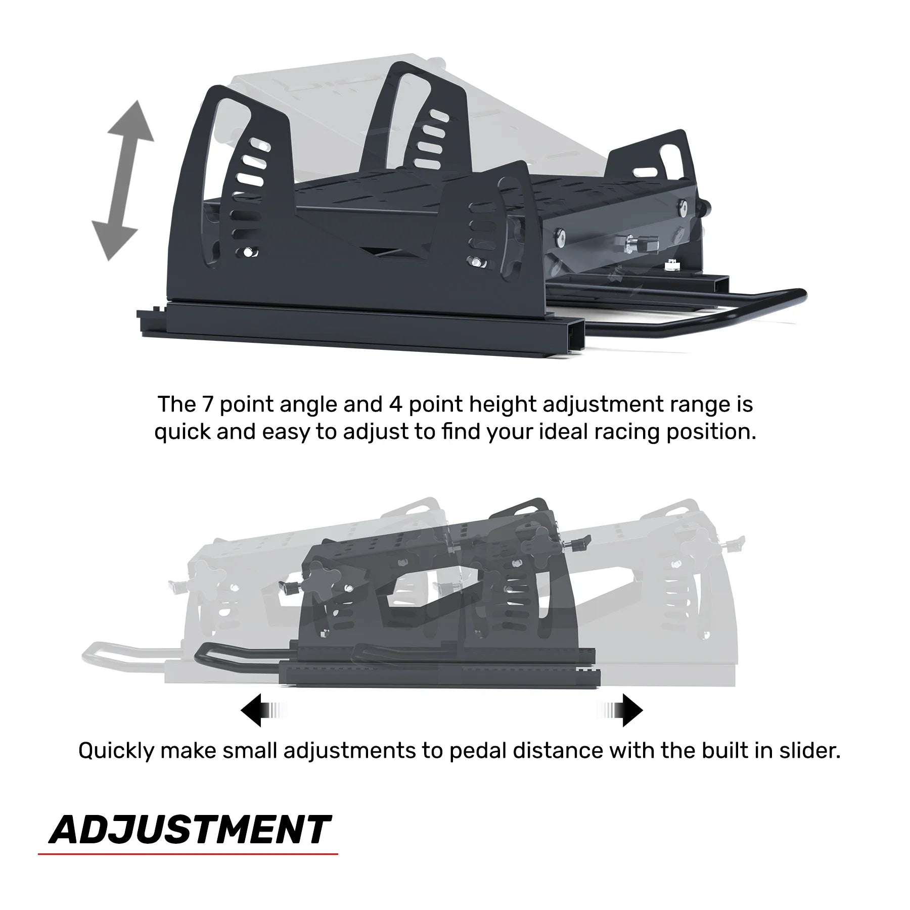 The TITAN Pedal Adjustment Plate provides a versatile and customizable mounting solution. With its 7-point rear and 4-point front adjustment range, it enables swift adjustments, allowing you to fine-tune your racing position to perfection.