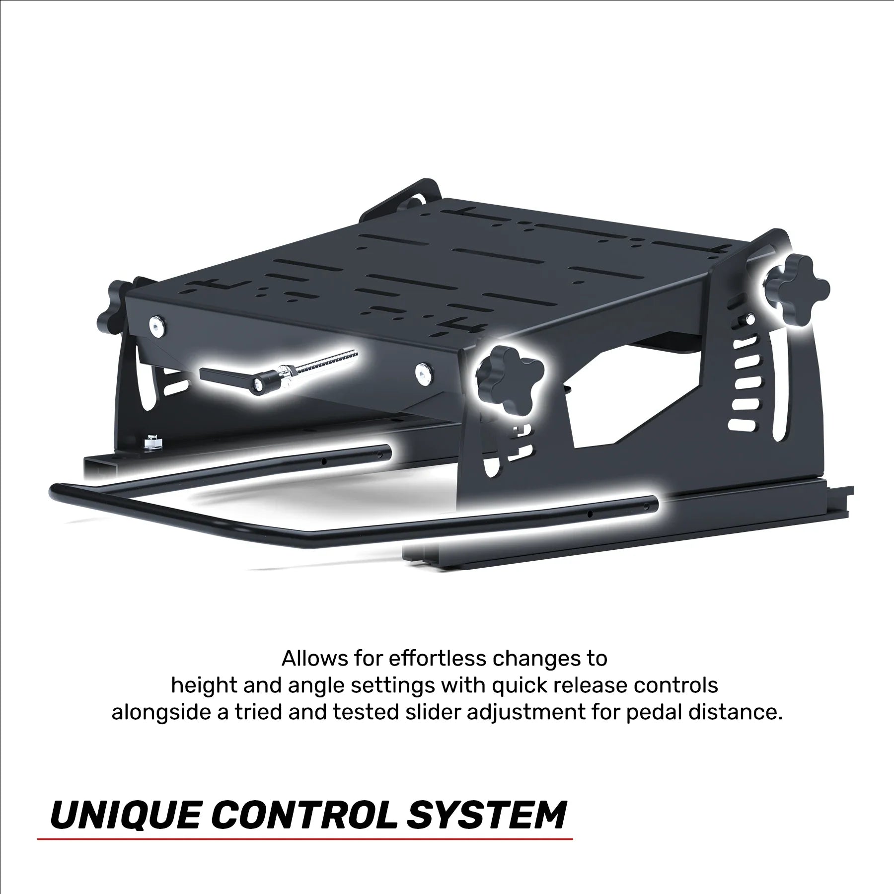 Unlock the hand bolts on your pedal plate to access the unique control system. Easily adjust height and angle settings using Bristol levers, and fine-tune pedal distance from your seat with a convenient slider bar.